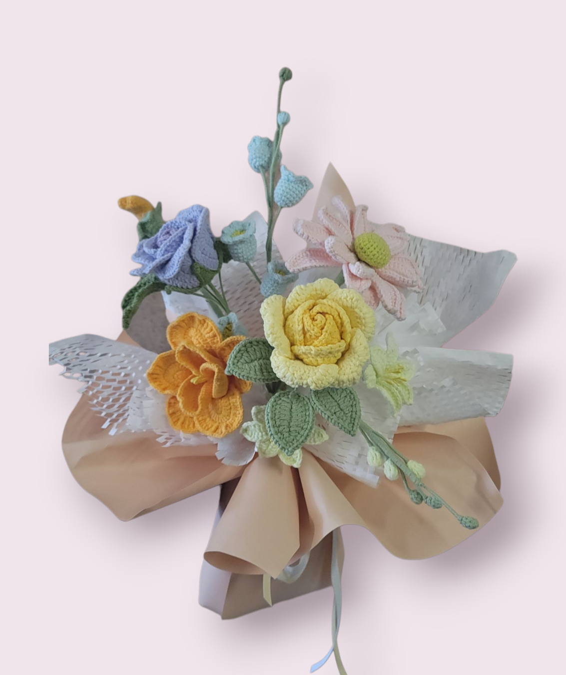 This charming handmade bouquet features intricately crocheted flowers in soft pastel shades. The bouquet includes two zinnias in lavender and pink. With other varieties of blooms in pastel shade create a cozy, heartwarming aesthetic, making it a perfect gift for someone special.